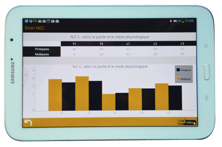 COW notes vous permet de valoriser toutes les saisies des 12 dernières visites. Afin de vous fournir un maximum de renseignements, ce n’est pas moins de 75 graphiques et tableaux que COW notes édite automatiquement. Vous trouverez ainsi très facilement les renseignements importants pour le suivi de votre troupeau ou compléter les fiches de visites ou de suivis.